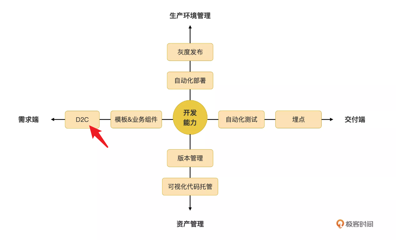在[第15讲]中,我们简要讨论了低代码平台除了关注开发能力之外,还需要关注哪些能力的建设,你可以回顾一下这一讲。在那一讲中,我给出了下面这个低代码平台能力之外的能力雷达图,其中水平线上,靠近需求端,有一个D2C(Design to Code)的能力,这正是今天这一讲我们要解决的问题。