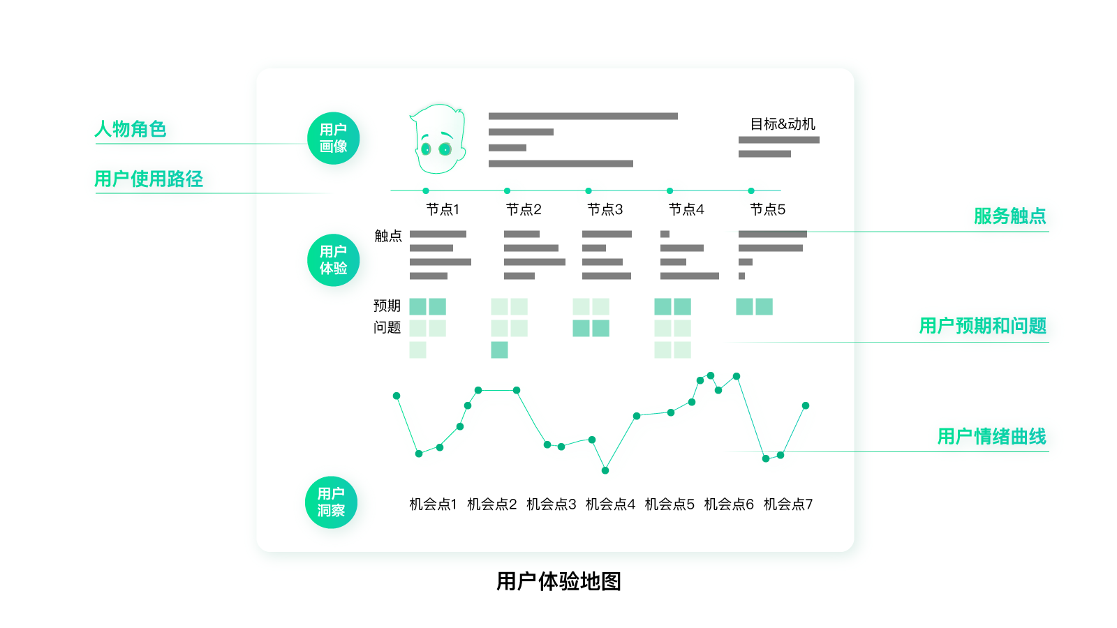 上图是一个示例,我们可以根据情况在此基础上增加或删减内容。由于用户体验地图不是我要讲的重点,在网上也能查到很多相关内容,所以这里只做简单介绍。