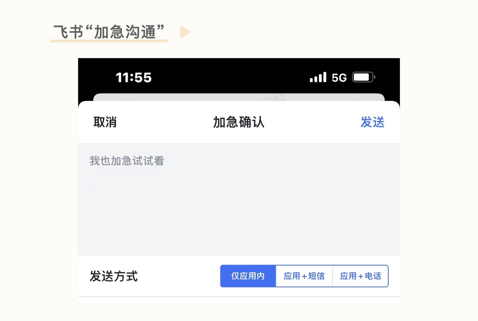 伴随着企业办公市场越来越激烈,各家产品的很多功能点也越来越像。飞书一直都有考勤打卡的功能,人事审批、客户管理、对外沟通、关联组织这些“帮助传统企业老板做好管理”的功能,飞书都已经拥有,很多Push员工沟通以及反馈的功能,比如“加急沟通”,飞书也有,直接大屏幕弹出来让你崩溃,再不理会,就直接电话过去。