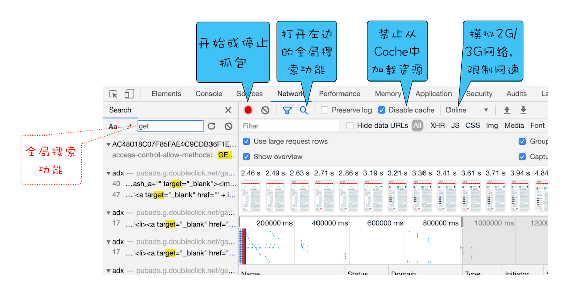 - Online按钮,是“模拟2G/3G”功能,它可以限制带宽,模拟弱网情况下页面的展现情况,然后你就可以根据实际展示情况来动态调整策略,以便让Web应用更加适用于这些弱网。
