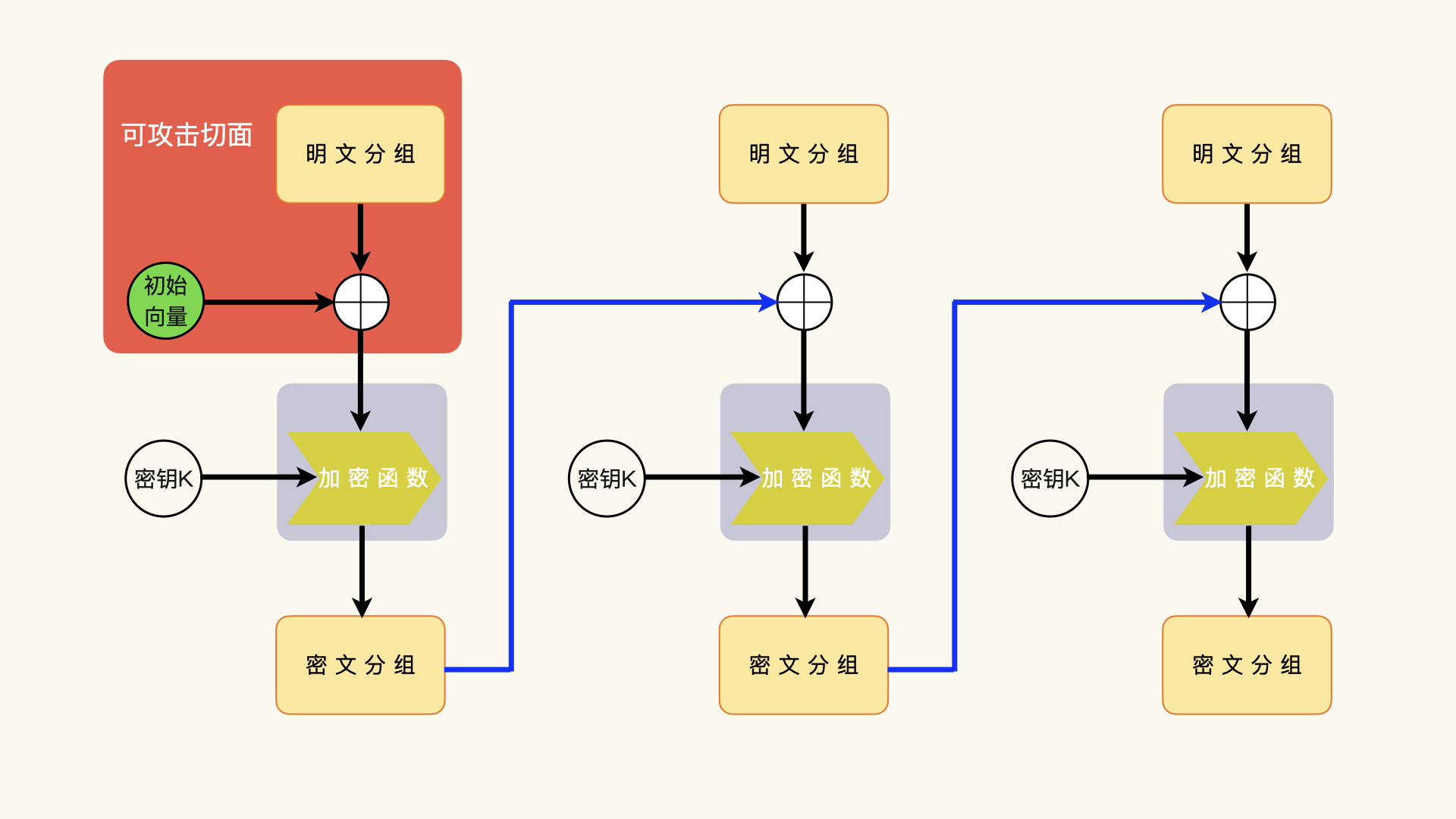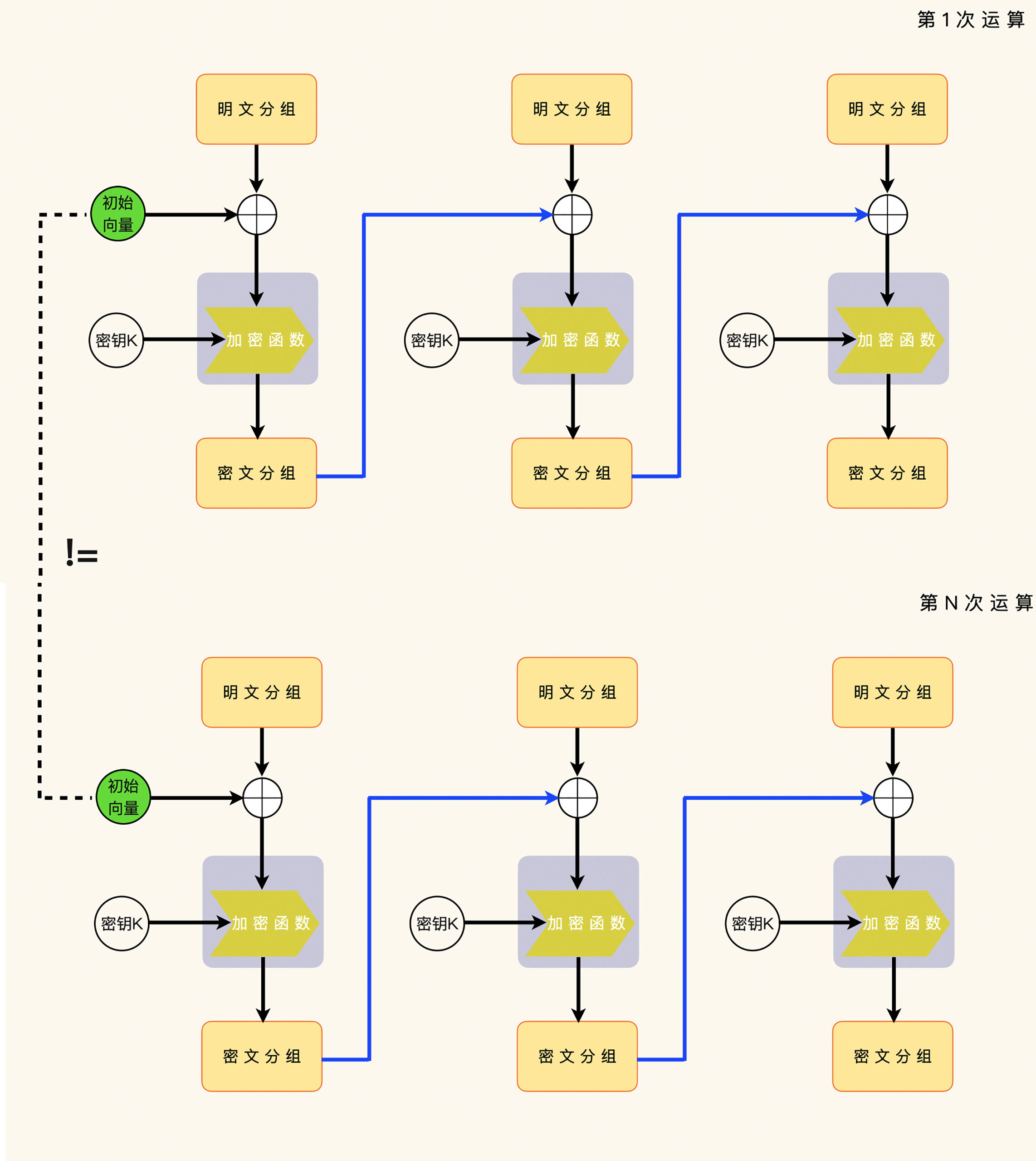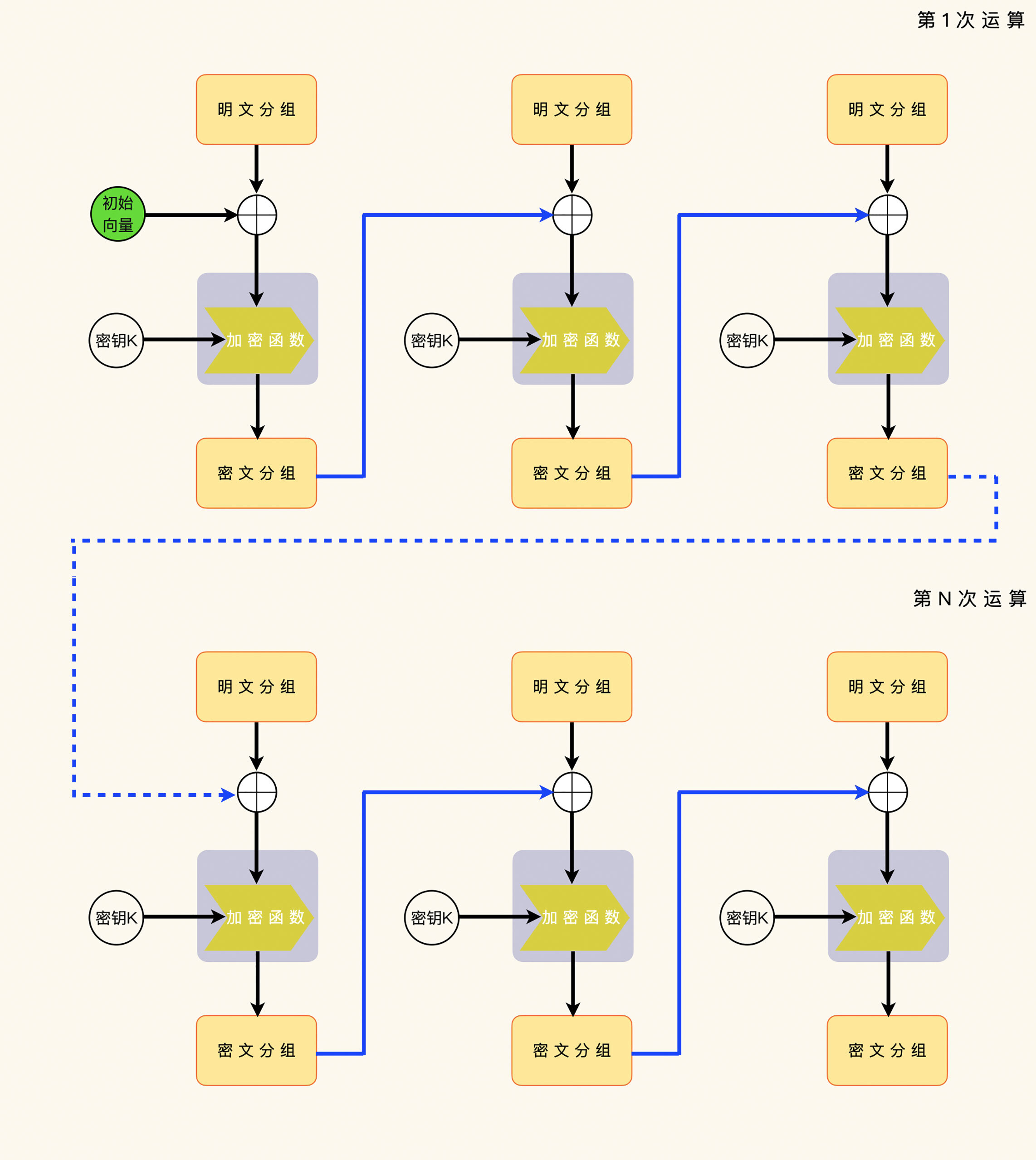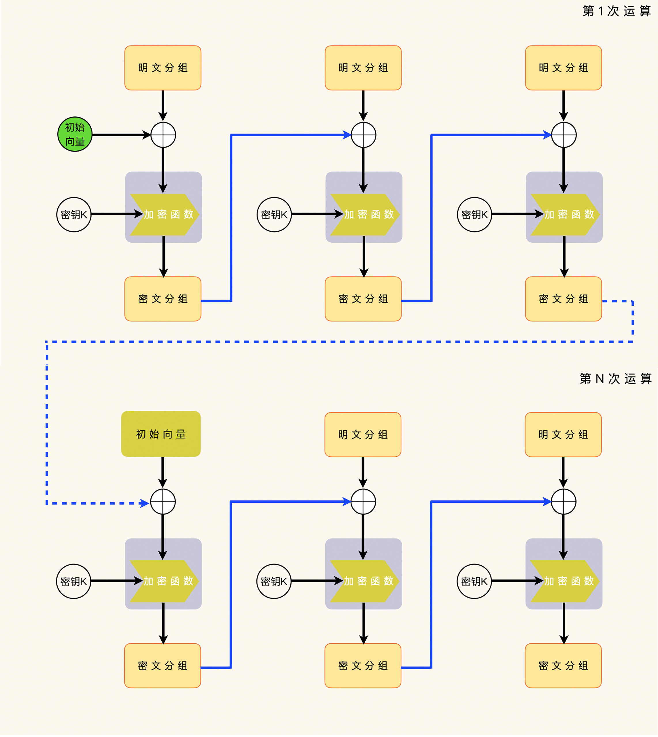 一个改进的办法,就是继续使用上一次加密运算的最后一个密文分组,同时把每一次运算的初始化向量当做第一个明文分组来处理。