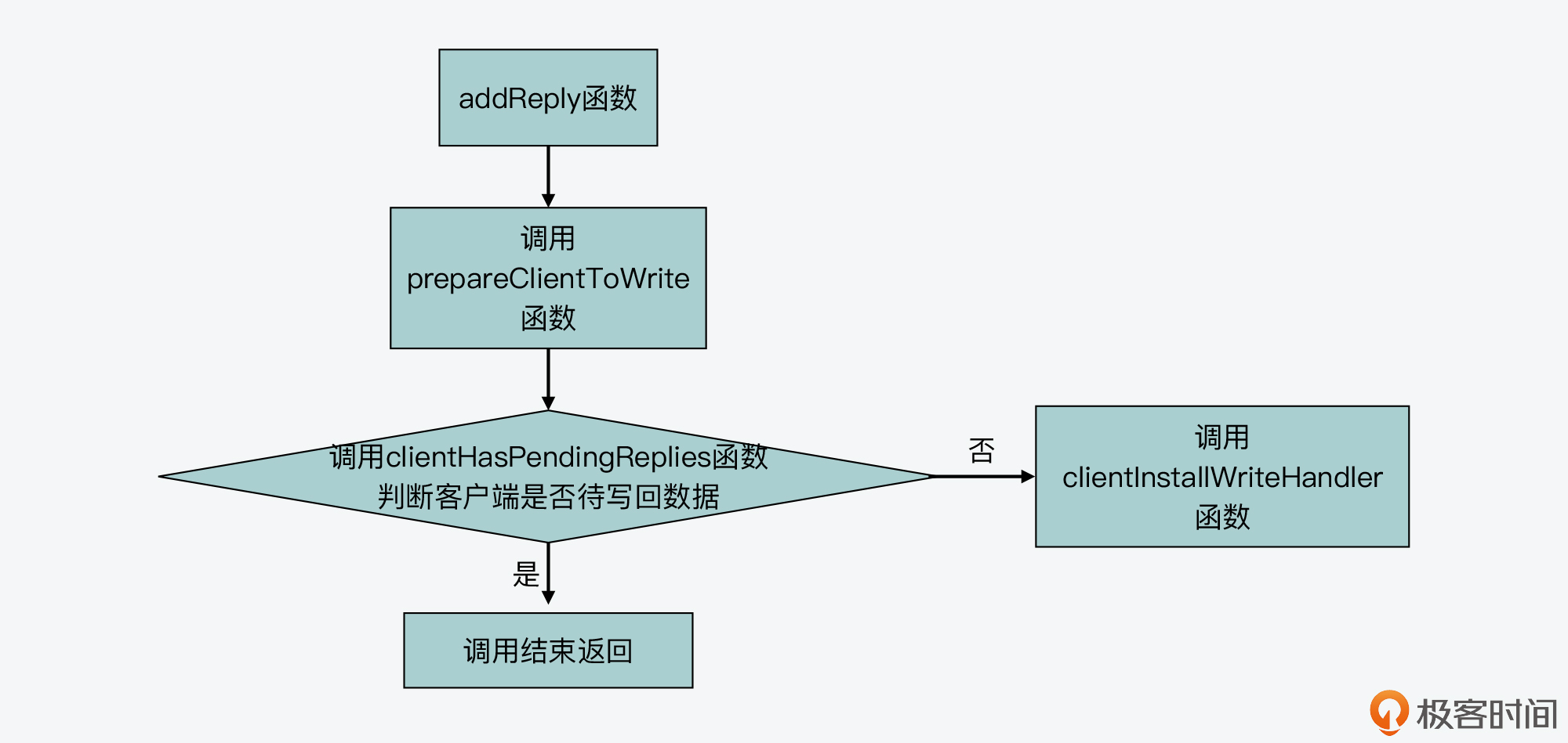 在第4步,handleClientsWithPendingWritesUsingThreads函数会再次检查clients_pending_write列表中,是否还有待写的客户端。如果有的话,并且这些客户端还有留存在缓冲区中的数据,那么,handleClientsWithPendingWritesUsingThreads函数就会调用connSetWriteHandler函数注册可写事件,而这个可写事件对应的回调函数是sendReplyToClient函数。