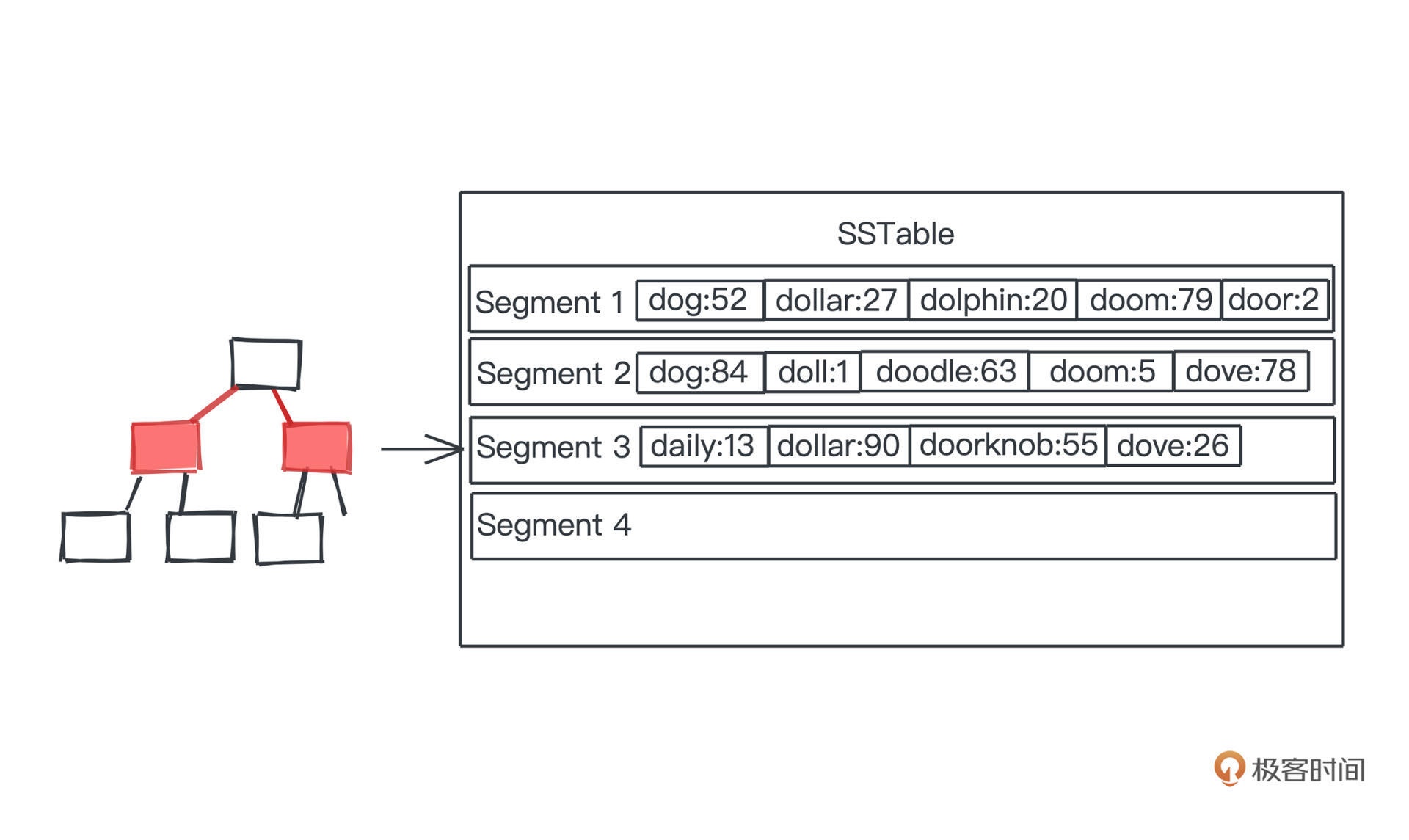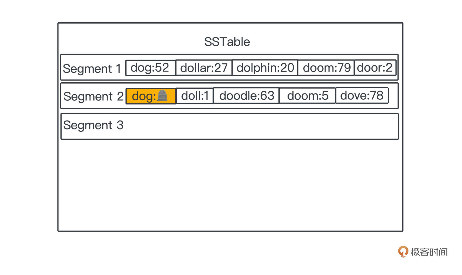 在图的例子中可以看出来,我们合并segment1、2、3之后,在得到的segment4里,dog的记录就只剩更新的segment2中的记录84了。这样我们的整个存储空间就不会无尽地膨胀,最高的一层,最多也就是占用历史以来所有出现过的key和对应的记录值这样数量级的空间,而存储这些是数据库本应做到的。