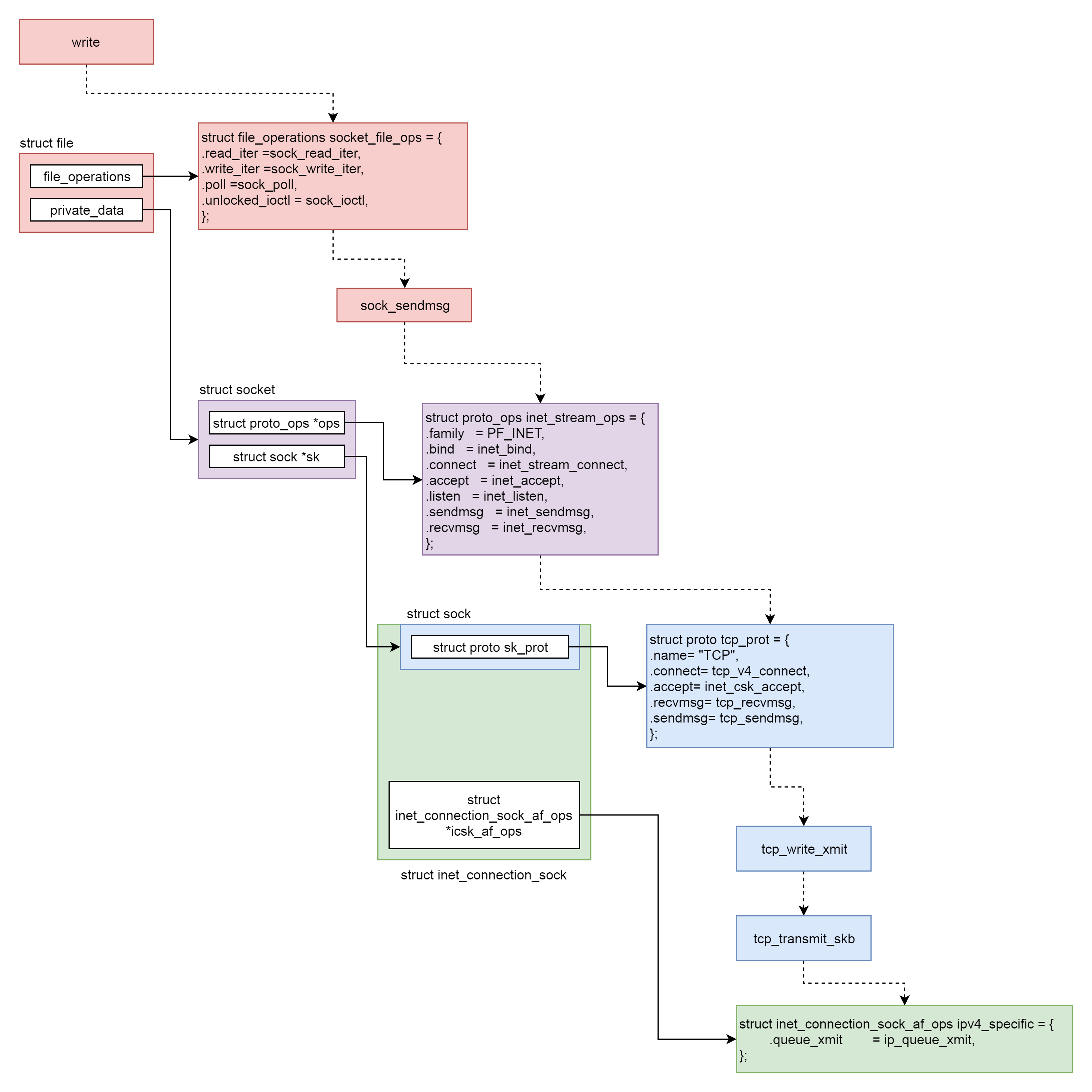 1 2 3 4 5 6 7 int inet_sendmsg(struct socket *sock, struct msghdr *msg, size_t size) { struct sock *sk = sock->sk; ...... return sk->sk_prot->sendmsg(sk, msg, size); }