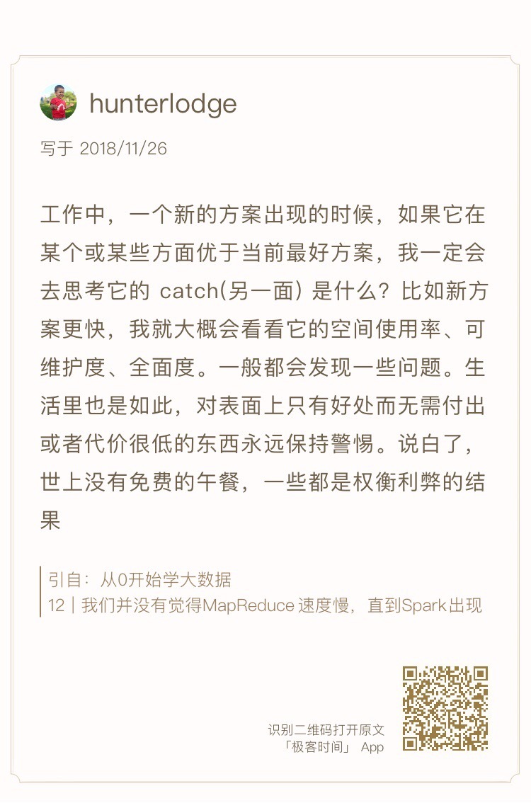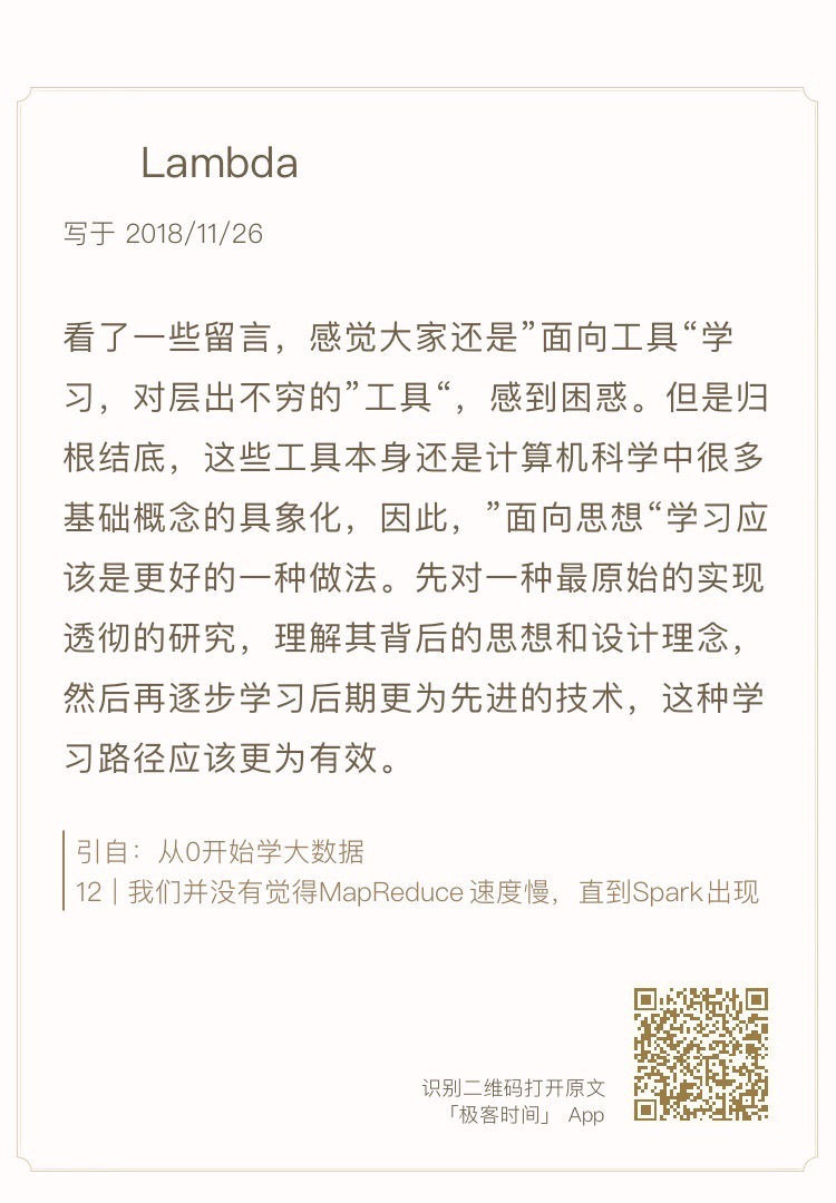 今天我帮你把专栏前面讲过的大数据技术串联起来,并放到了比较具体的应用场景中,后面在专栏模块四,我们还会讨论如何将这些技术产品集成为一个大数据平台,希望能帮你更进一步了解大数据技术的应用方法和使用场景,请你一定坚持把专栏学完。