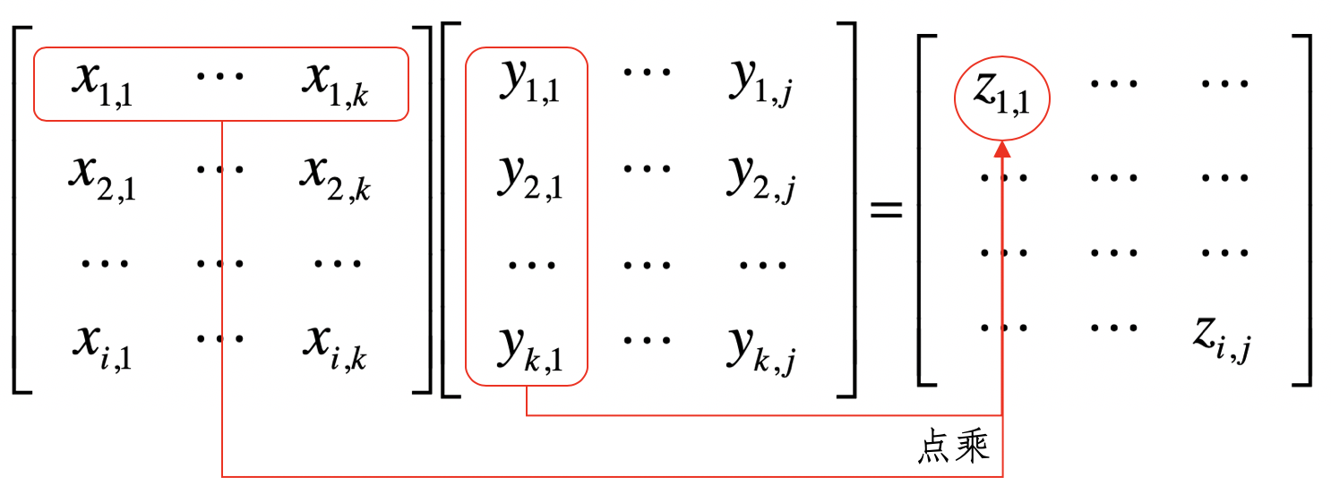 其中,矩阵$Z$为矩阵$X$和$Y$的乘积,$X$是形状为i x k的矩阵,而$Y$是形状为k × j的矩阵。$X$的列数k必须和$Y$的行数k相等,两者才可以进行这样的乘法。