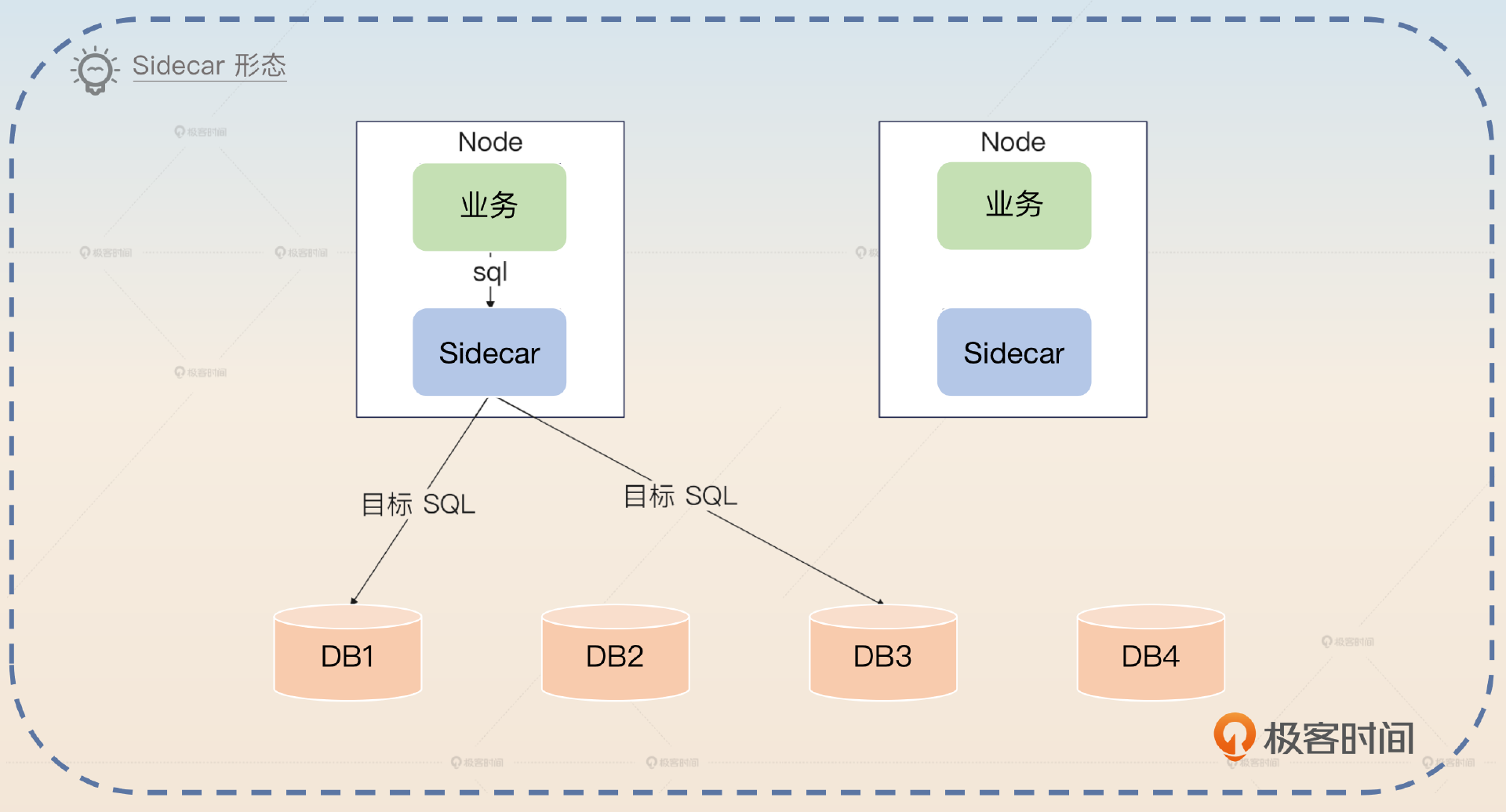 - Sidecar 形态:简单来说就是一个提供了分库分表的 Sidecar。这是一个理论上的形态,现在并没有非常成熟的产品。
