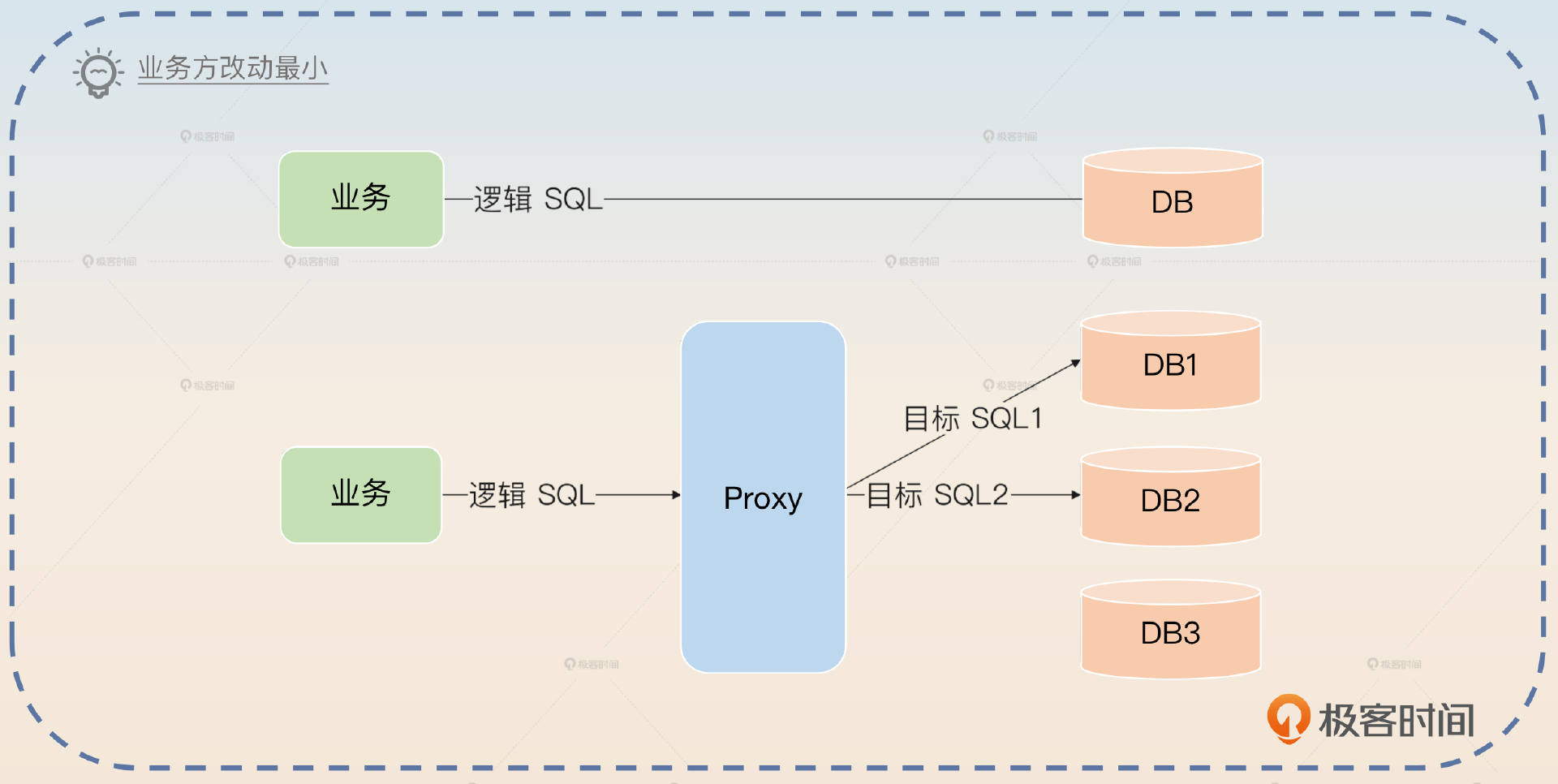 Proxy 形态性能最差,因为所有的数据库查询都发给了它,很容易成为性能瓶颈。尤其是单机部署 Proxy 的话,还面临着单节点故障的问题。它的优点就是跟编程语言没有关系,所以部署一个 Proxy 之后可以给使用不同编程语言的业务使用。同时,Proxy 将自己伪装成一个普通的数据库之后,业务方可以轻易地从单库单表切换到分库分表,整个过程对于业务方来说就是换了一个数据源。