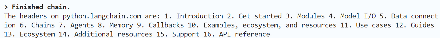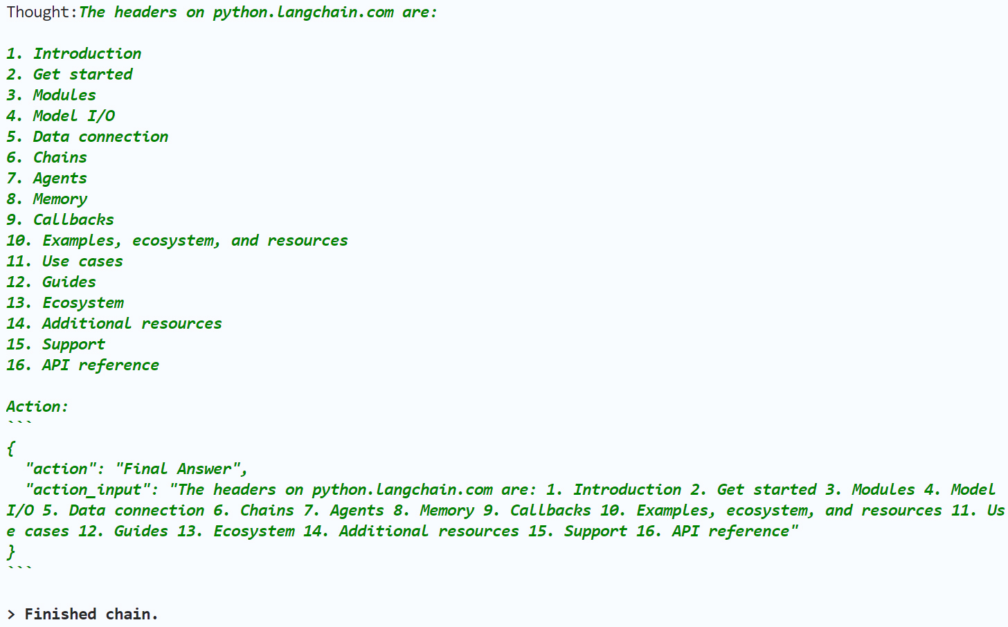 AgentExecutor Chain结束之后,成功输出python.langchain.com这个页面中各级标题的具体内容。