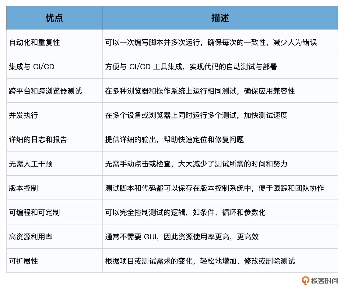 下面这个表,我列出了使用命令行进行自动化网页测试的优势。