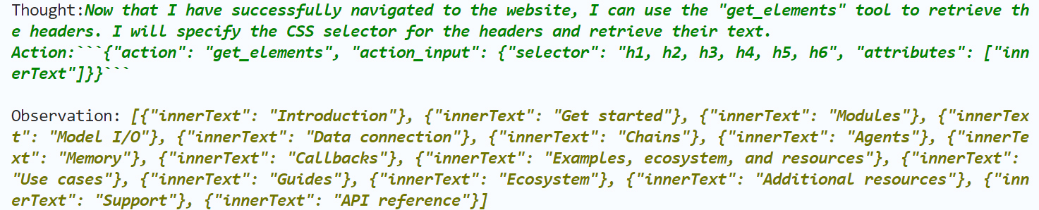 Thought:Now that I have successfully navigated to the website, I can use the “get_elements” tool to retrieve the headers. I will specify the CSS selector for the headers and retrieve their text.