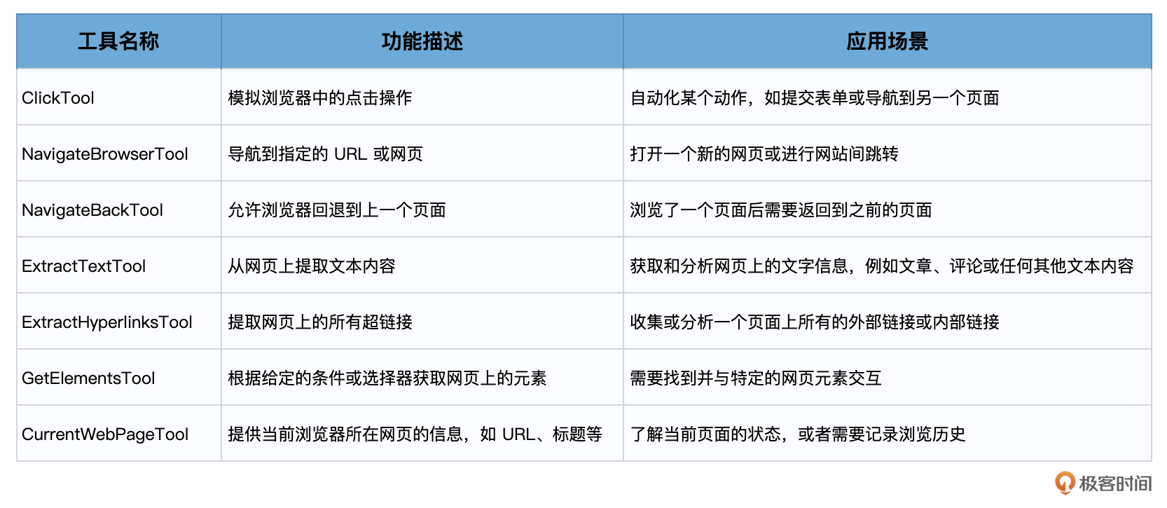 - Web 浏览器工具集:官方的 PlayWright 浏览器工具包,允许代理访问网站、点击、提交表单和查询数据。