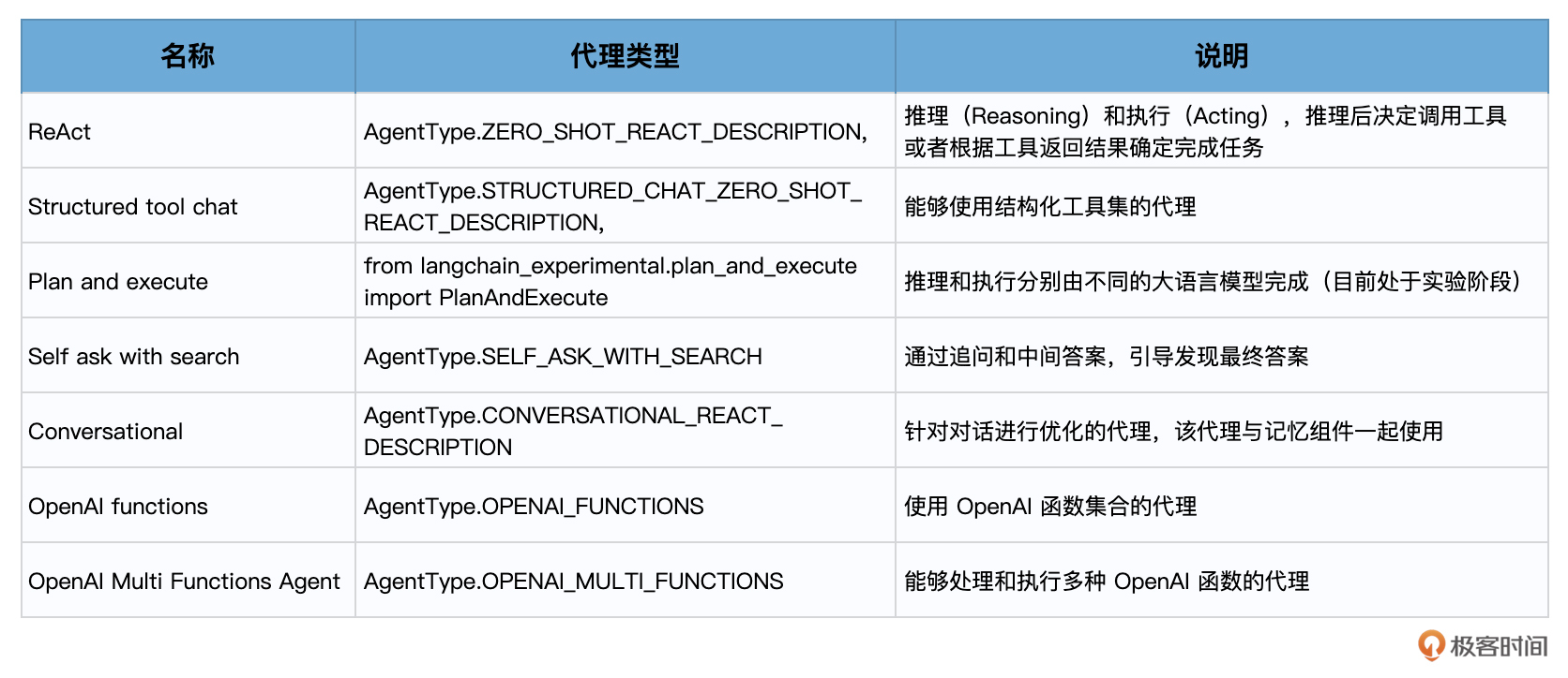 第一个表,是LangChain中常见的代理类型和它们的介绍。在这些代理中,有很多我们已经一起使用过了,有些则需要你自己去阅读相关文档,自己去探索它的使用方法。