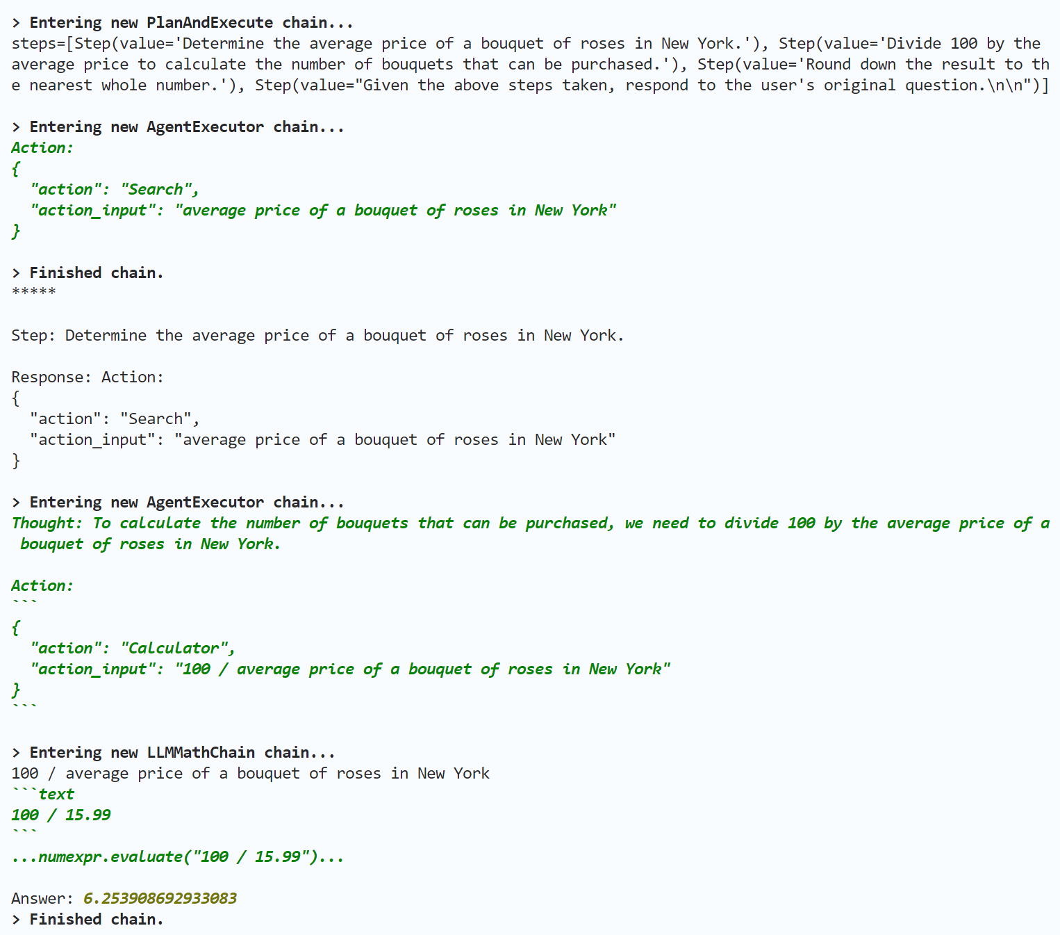 在上面输出中,PlanAndExecute 链的调用流程以及代理的思考过程,我就留给你来做分析了,相信你可以把握住Plan and execute代理解决问题的基本脉络。