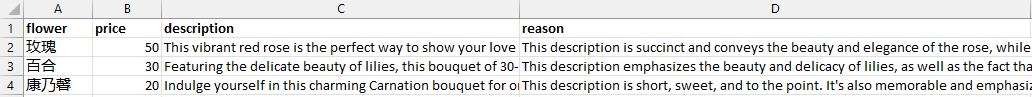 最后,把所有信息整合到一个pandas DataFrame对象中(需要安装Pandas库)。这个DataFrame对象中包含了flower、price、description 和 reason 这四个字段的值。其中,description 和 reason 是由 output_parser 从模型的输出中解析出来的,flower 和 price 是我们自己添加的。