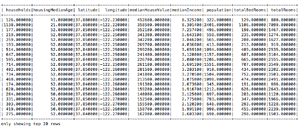 1 | df.groupBy("housingMedianAge").count().sort("housingMedianAge",ascending=False).show() |