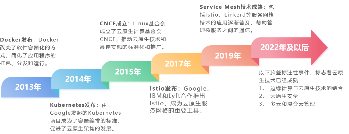 云原生并不是一个新技术,从2013年Docker发布,拉开了单体软件架构变革的帷幕,到2019年Service Mesh技术成熟,软件架构微服务化设计也深入人心,践行者获益良多,再到2022年云原生技术逐渐成熟。至今,云原生技术早已深入人心。下面这个图展示了云原生技术的关键里程碑。