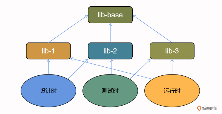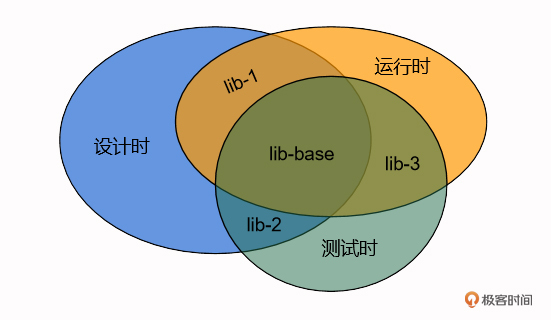 现在要做的第一步,就是将各个时态的硬耦合部分拆开,方法也不复杂,就是把重叠的部分抠出来作为库,这样重叠的两个时态只需要对这些库产生依赖,而时态之间没有直接依赖了。拆开之后的逻辑关系图如下: