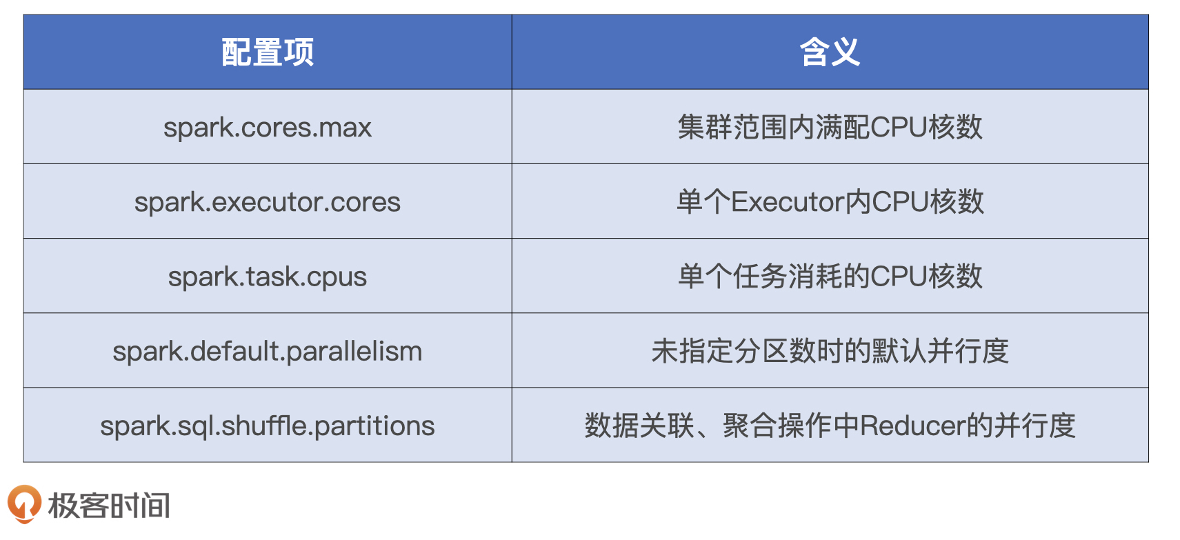 为了充分利用划拨给Spark集群的每一颗CPU,准确地说是每一个CPU核(CPU Core),你需要设置与之匹配的并行度,并行度用spark.default.parallelism和spark.sql.shuffle.partitions这两个参数设置。对于没有明确分区规则的RDD来说,我们用spark.default.parallelism定义其并行度,spark.sql.shuffle.partitions则用于明确指定数据关联或聚合操作中Reduce端的分区数量。