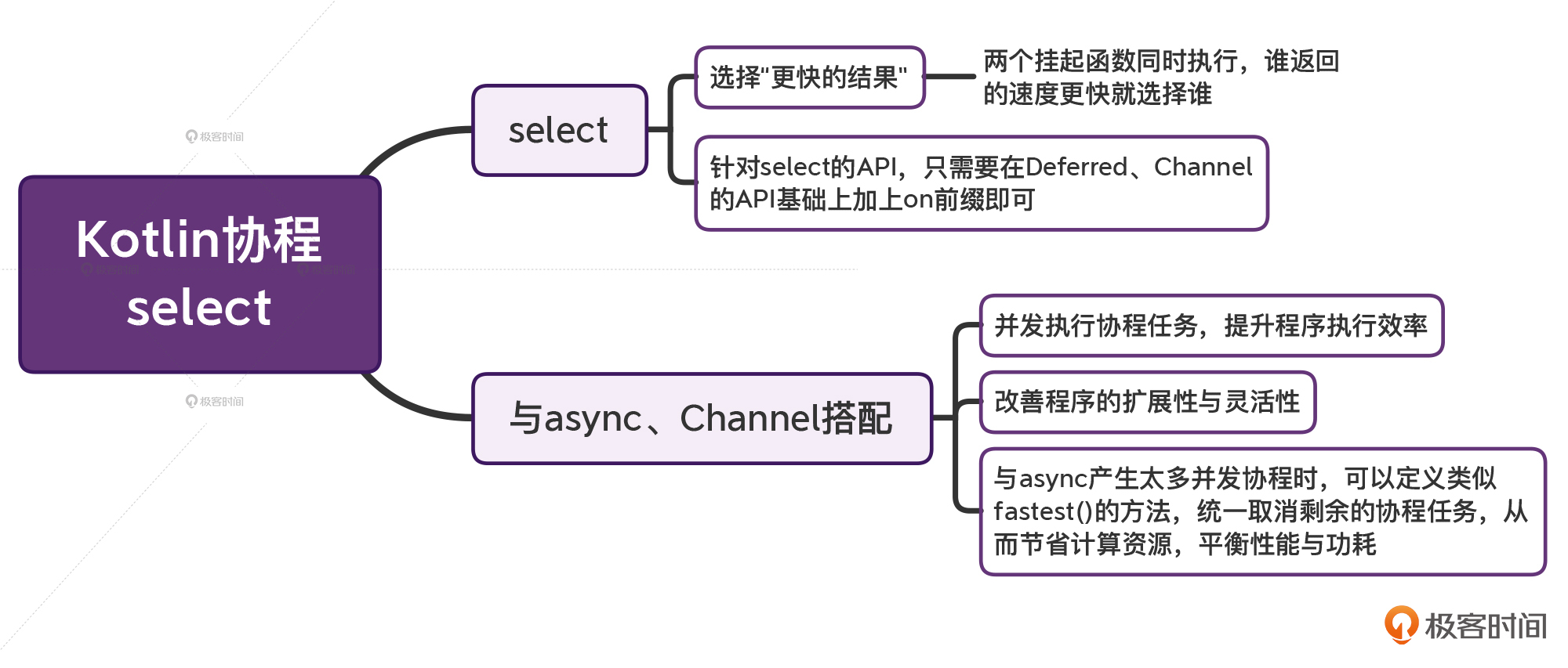思考题 前面我们已经说过,select的API,只需要在Deferred、Channel原本API的基础上加一个on前缀即可。比如onAwait{}。那么,你有没有觉得它跟我们前面学的onStart{}、onCompletion{} 之类的回调API很像?