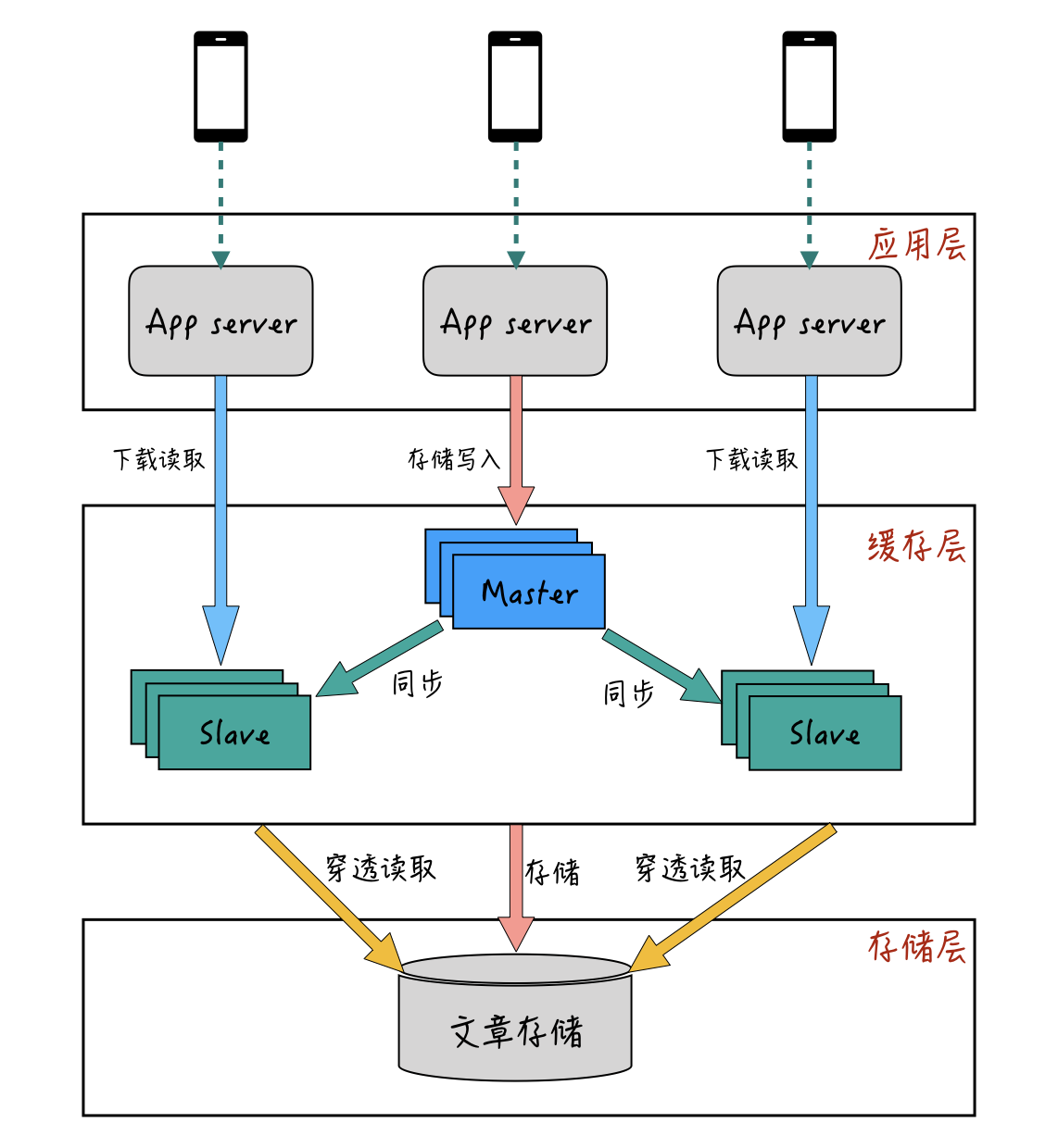 我以上面的“长文章流量热点”的例子来说明一下。为了防止文章下载阅读出现热点时,造成后端存储服务的压力太大,我们一般会通过缓存来进行下载时的加速。比如说,我们可以通过文章的唯一ID来进行哈希,并且通过缓存的一主多从模式来进行部署,主从模式的部署大概如下图: