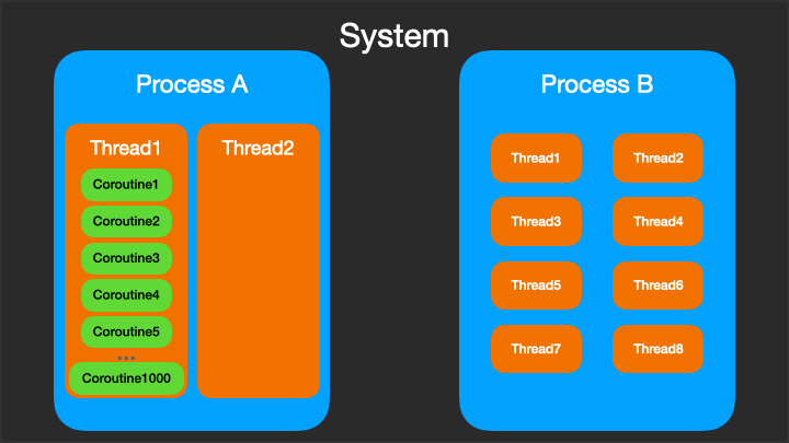 比如,下面这张图就展示了协程、线程与进程之间的关系。它能帮你在大脑里建立一个清晰、具体的协程模型。