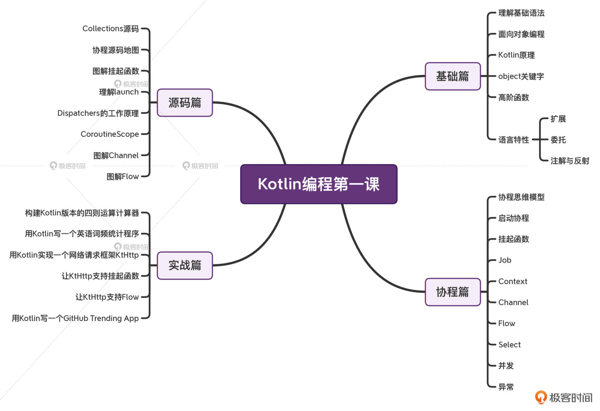 所以在课程中,我会尽量去揣测Kotlin设计者的思路,去对比Kotlin和Java语法的差异,然后用一些实际案例来给你讲解Kotlin新特性的使用场景。具体来看,这个课程主要分为四个部分。