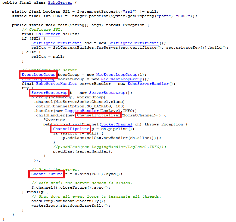 上面的例子,虽然代码很短,但已经足够体现出Netty的几个核心概念,请注意我用红框标记出的部分: