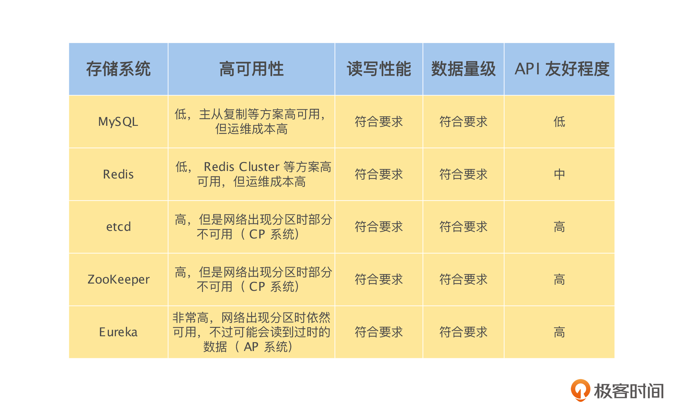 通过上面的分析,我们可以看到,MySQL 和 Redis 在高可用性和 API 友好程度上不满足要求,而 etcd、ZooKeeper 和 Eureka 这三个存储系统中,更适合的是 Eureka。下面我们来讨论一下,为什么 Eureka 这样的 AP 系统要比 etcd 和 ZooKeeper 这样的 CP 系统更合适。