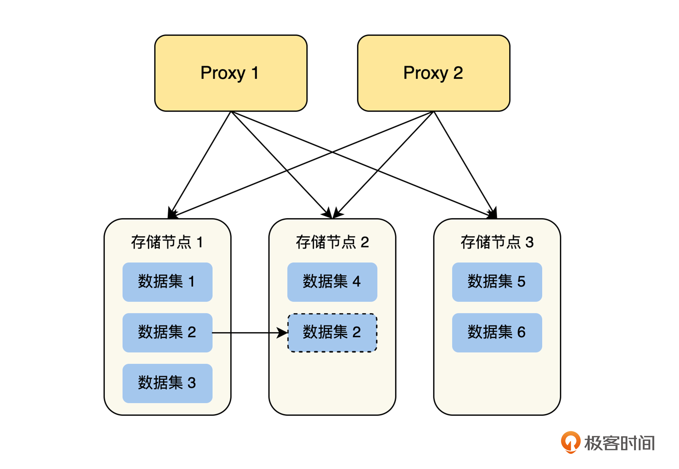 从上图可以看出,在进行数据迁移前,Proxy 对数据集 2 的读写请求,都会路由到存储系统 1 上。我们通过配置中心,配置好数据迁移的配置后,如果 Proxy 1 已经加载了数据迁移的配置,Proxy 2 还没有接收到数据迁移的配置,那么在处理数据集 2 的请求时,就会出现 Proxy 1 读写存储节点 2,Proxy 2 读写存储节点 1 的情况,导致数据不一致的问题,反过来也是一样的。