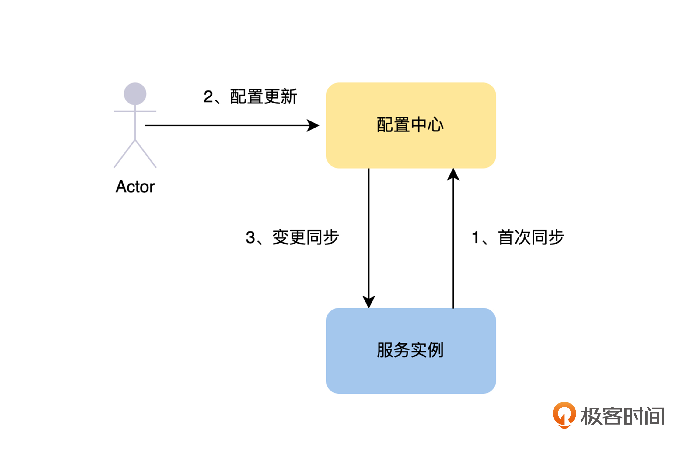 然后,在实例的运行过程中,如果服务的配置有修改,配置中心需要及时同步到实例,即变更同步:如上图中的 2 和 3,服务的配置信息有变更后,配置中心监听到服务的配置修改了,需要及时通知到服务的所有实例。这里可以采用“发布/订阅”的模式,也可以采用轮询模式,比如每 30 秒去配置中心查询一下,配置是否有变更。这里的数据同步是最终一致性的。