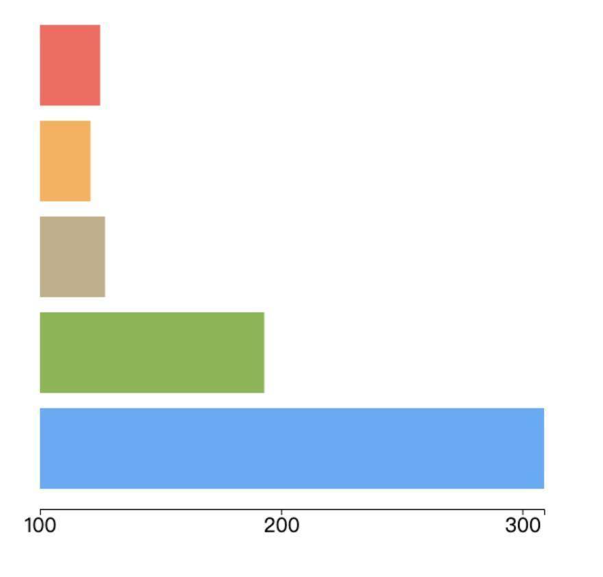 如上面代码所示,我们通过 d3.axisBottom 创建一个底部的坐标。我们可以通过tickValues给坐标轴传要显示的刻度值,这里我们显示100、200、300三个刻度。同样我们可以用scale函数将这些数值线性映射到500像素区间,值从100到309。