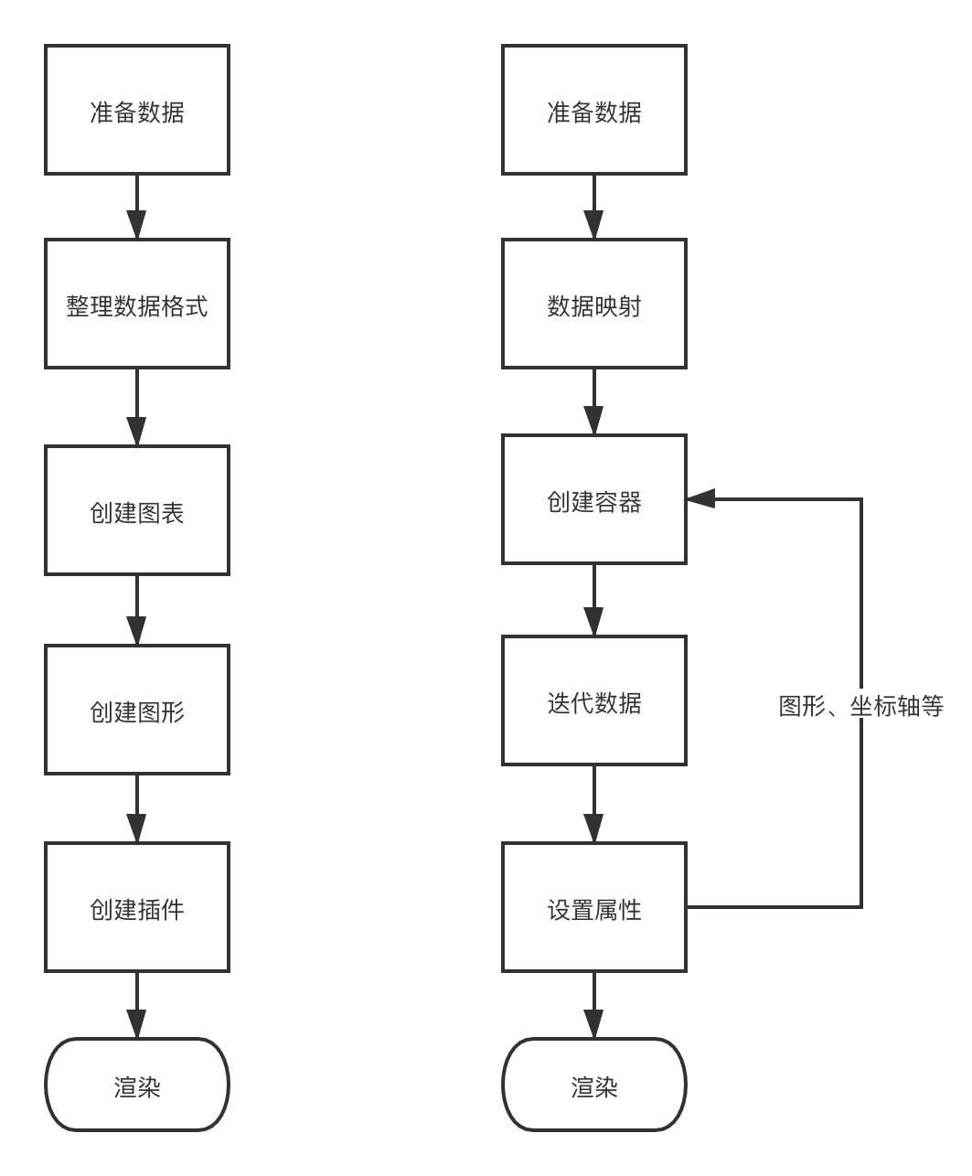 与直接使用图表库不同,使用数据驱动框架不要求固定格式的数据格式,而是通过对原始数据的处理和对容器迭代、创建新的子元素,并且根据数据设置属性,来完成从数据到元素结构和属性的映射,然后再用渲染引擎将它最终渲染出来。