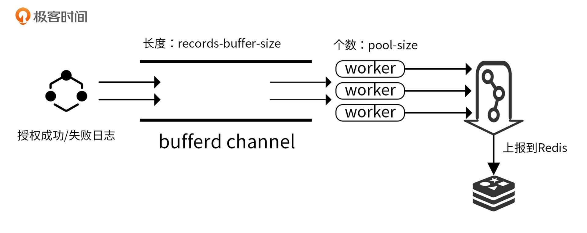 case <-time.After(r.recordsBufferFlushInterval)代码段实现。 - 支持优雅关停:当 recordsChan 关闭时,将 recordsBuffer 中的消息批量投递给 Redis,之后退出 worker 协程。