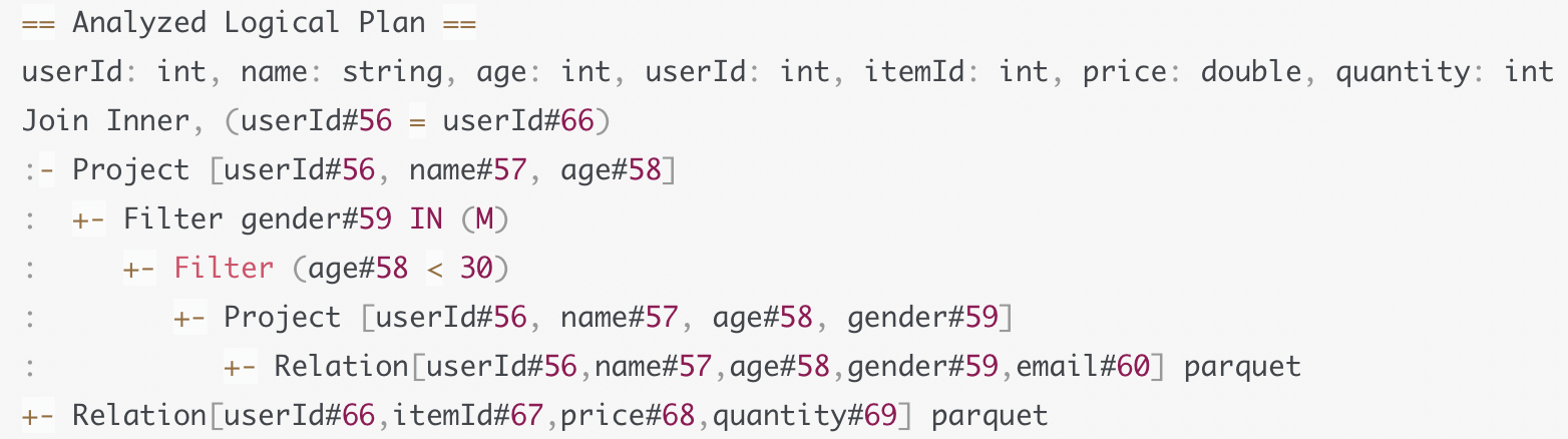 最终,被Catalyst优化过后的小Q,就从“Analyzed Logical Plan”转换为“Optimized Logical Plan”,如下图所示。我们可以看到,谓词下推和列剪裁都体现到了Optimized Logical Plan中。