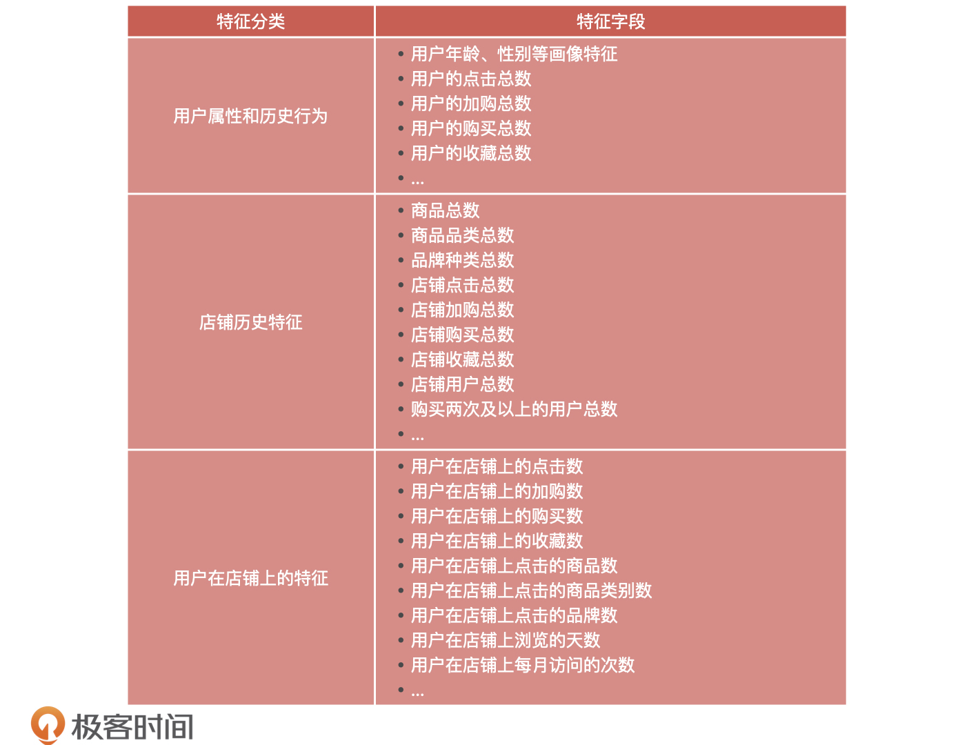 那我们今天要讲的这个案例,它的数据样本主要抽取了“618”之前和之后 3 个月内,匿名用户的购买行为日志数据、用户画像数据,以及是否为复购用户的标签。这些样本数据会以用户行为日志表、用户属性特征表,以及用户复购统计表的形式展示出来。
