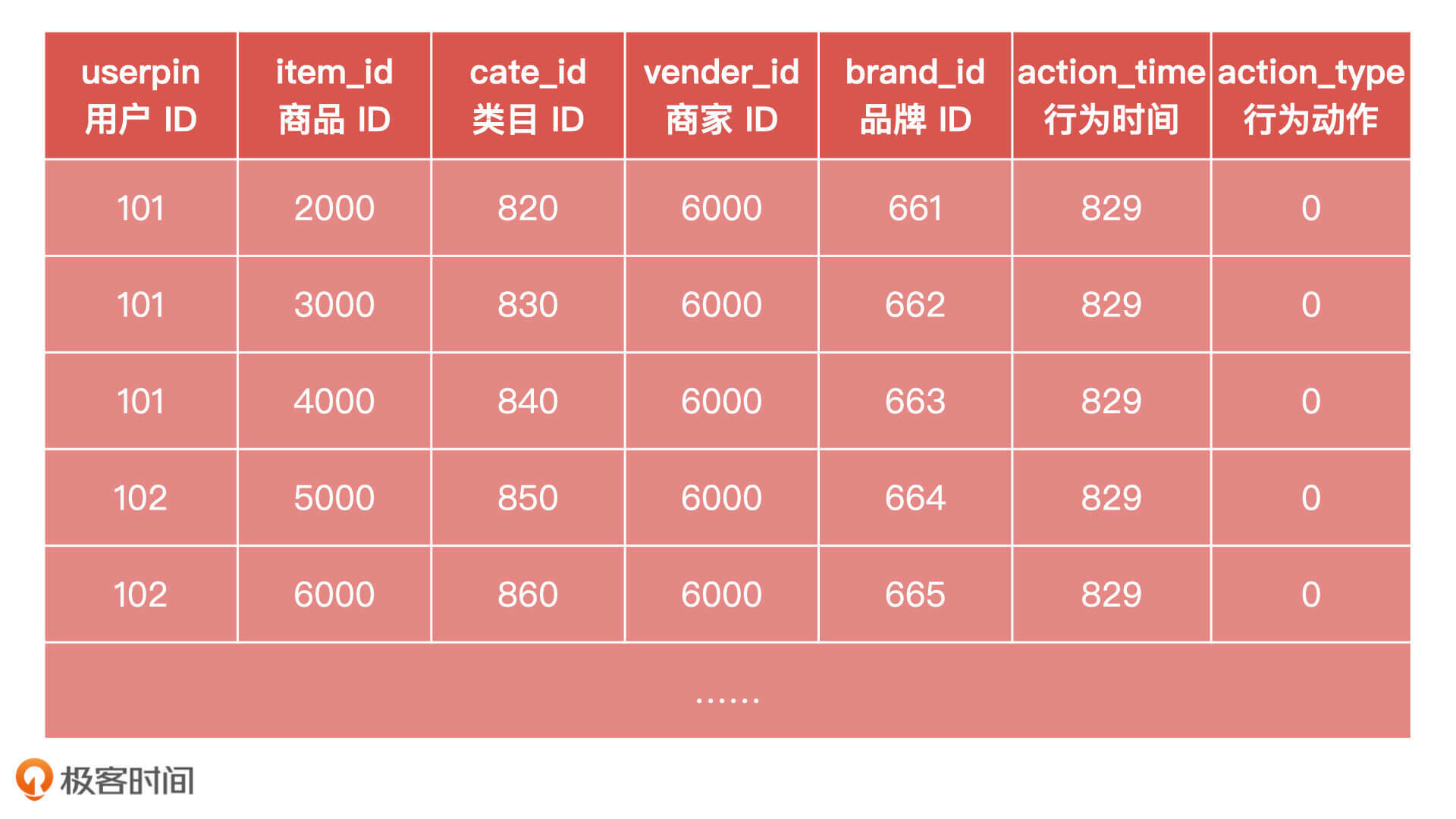 其中,用户行为动作取值范围是:0、1、2、3。其中,0 表示点击、1 表示加购、2 表示下单、3 表示收藏。