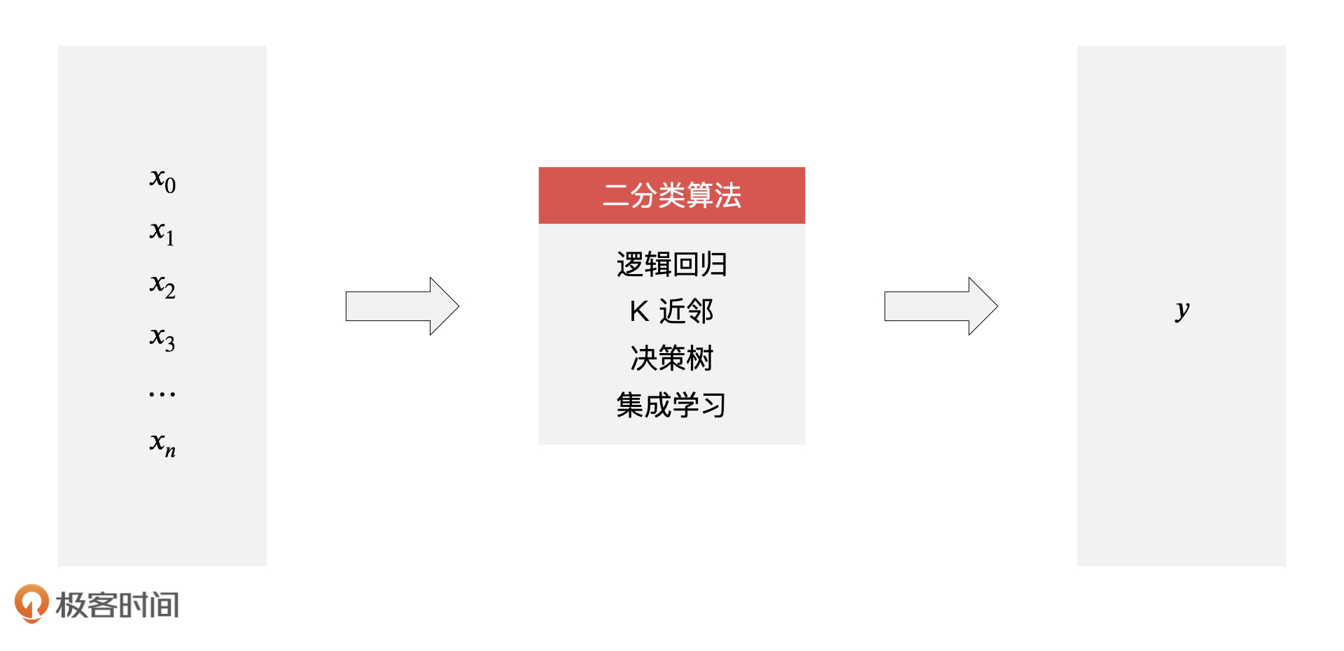 对于算法的选型,我们可以选择之前课程中学习的算法,如逻辑回归、K 近邻、决策树、随机森林等等。每一个算法都可以训练出一个 数学公式: $ x $(样本)到 数学公式: $ y $(标签)的函数,然后在使用的过程中,我们只需要通过这个函数导入一个未知的 数学公式: $ x $,就可以预测出对应的 数学公式: $ y $ 标签的概率,然后我们再将概率大于 0.5 (如果要求更高的复购概率可以提高 y 值)的 数学公式: $ y $ 值表示成复购,将概率小于 0.5 的 数学公式: $ y $ 值表示成不复购。