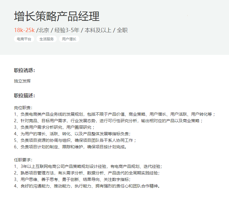关于岗位:构建复购预测模型一般是对增长产品经理的岗位要求,比如增长策略产品经理。增长策略的核心就是做用户运营,所以,如果你想要从事这方面的工作,那除了我今天讲的产品经理必备的知识以外,用户运营方面的知识你也要去了解。我在下面给出了一个增长策略产品经理的JD,你可以作为参考。