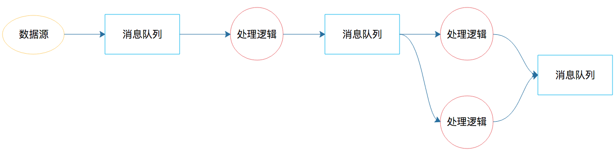 其实大数据实时处理的需求早已有之,最早的时候,我们用消息队列实现大数据实时处理,如果处理起来比较复杂,那么就需要很多个消息队列,将实现不同业务逻辑的生产者和消费者串起来。这个处理过程类似下面图里的样子。