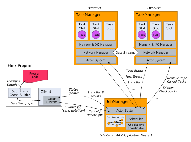 Flink的架构和Hadoop 1或者Yarn看起来也很像,JobManager是Flink集群的管理者,Flink程序提交给JobManager后,JobManager检查集群中所有TaskManager的资源利用状况,如果有空闲TaskSlot(任务槽),就将计算任务分配给它执行。