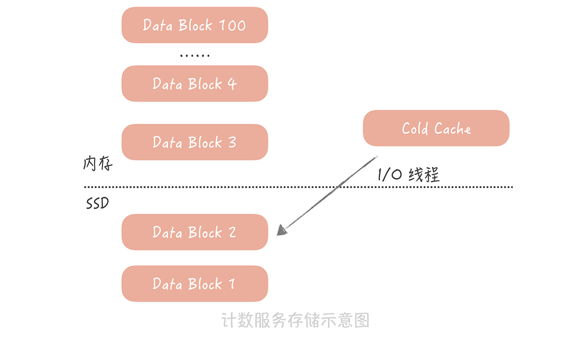 然而微博计数的数据具有明显的热点属性:越是最近的微博越是会被访问到,时间上久远的微博被访问的几率很小。所以为了尽量减少服务器的使用,我们考虑给计数服务增加SSD磁盘,然后将时间上比较久远的数据dump到磁盘上,内存中只保留最近的数据。当我们要读取冷数据的时候,使用单独的I/O线程异步地将冷数据从SSD磁盘中加载到一块儿单独的Cold Cache中。