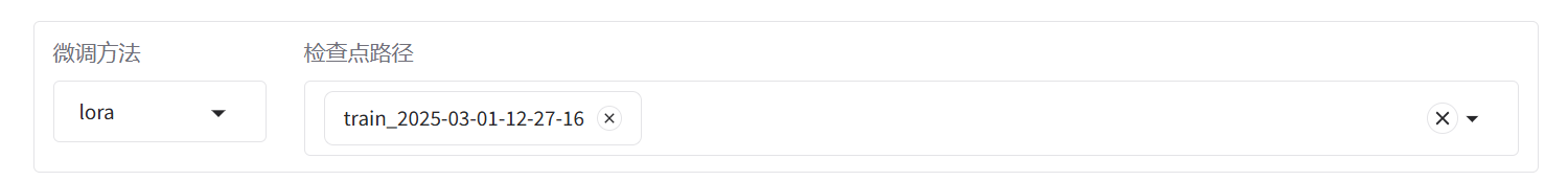 训练完成后,我们先来进行评估。点击上方的检查点路径,选择我们刚刚训练好的输出目录,就可以在模型启动时加载微调结果。