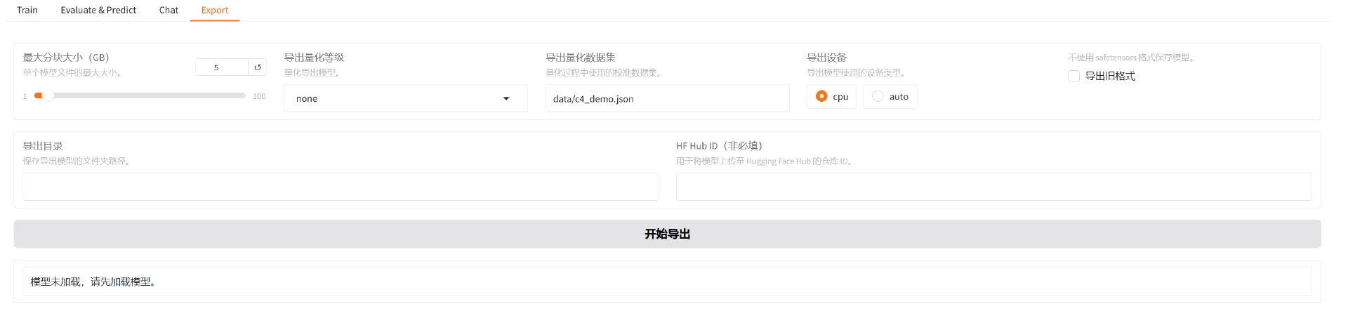 导出页面如下图所示。该页面是将微调后的模型导出成模型文件,以便用户做部署。导出的参数设置中,可以设置量化等级,从而导出Q8、Q4等不同级别的量化模型。