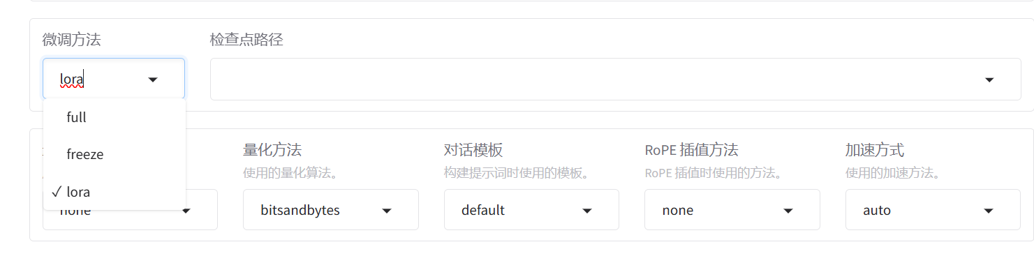 控制台提供了三种微调方法,分别是 Full、Freeze 和 LoRA。。