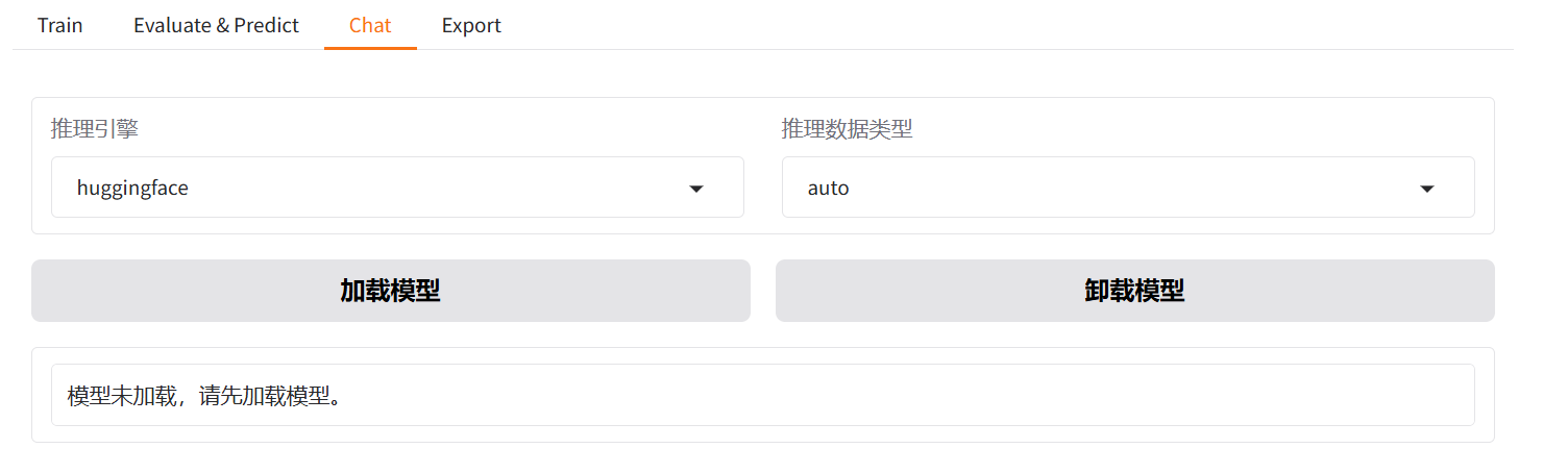 该页面展示了控制台的总体布局,该布局主要分为上下两个部分。上半部分可视为总体设置区域,涵盖了语言设置、模型选择、微调方法、量化参数、对话模板以及加速方式等内容。下半部分则由具体的功能菜单组成,分别为:训练(Train)、评估与预测(Evaluate & Predict)、对话(Chat)及导出(Export)四个功能模块。