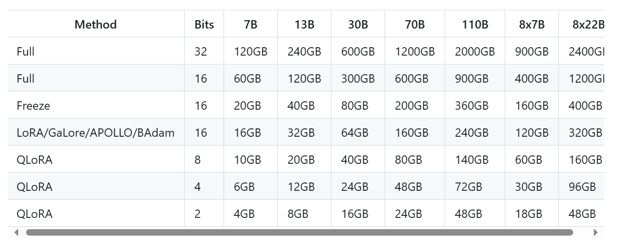下面的表格是 LLama-factory 官方给出的使用某种方法微调某种参数量的模型所需的最低显存大小。这些值都是估算出的经验值,实际生产中算力越充足越好。