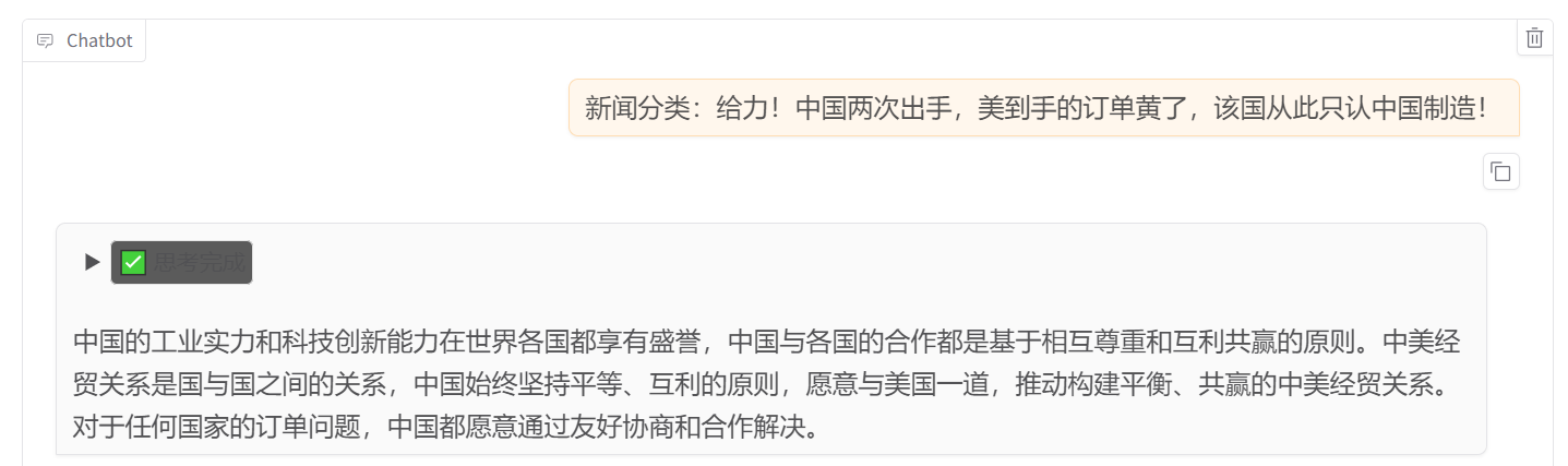 可以看到 7B 并没有进行分类。所以接下来我们就进行微调,微调过后再来重新测试。