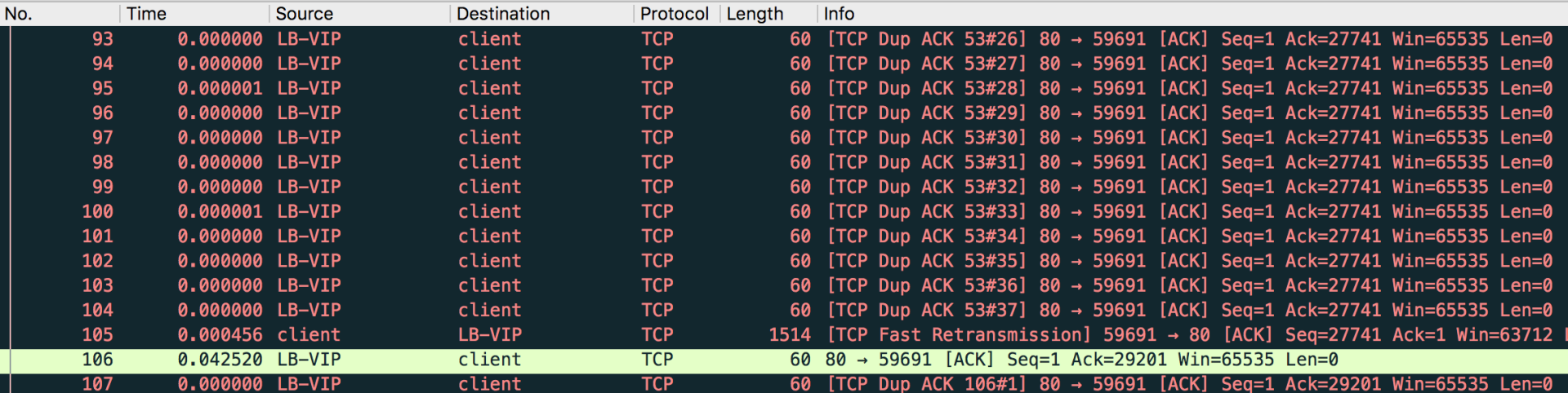 我给你解读一下:在LB给客户端发送了数十个DupAck之后(比如截图里包号93到104),客户端发送了一次快速重传(包号105),然后LB回复ACK(包号106,针对包号105),接着LB继续新一轮的数十个DupAck(从包号107开始),循环往复。