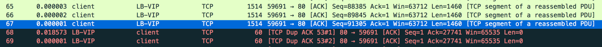 而这里出现几十次DupAck的原因是,一旦LB认为某个数据包我没有收到(此处是序列号为27741的数据包),那么数据就“断档”了,之后客户端送过来的每个数据包,LB都无法ACK这些数据包的序列号+TCP载荷字节数。所以虽然ACK包还是要发,但确认号却只能“停留”在丢包处的确认号,并且这样重复的ACK会有很多个。